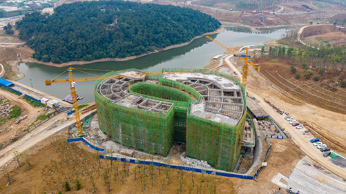 日前,市城控集團(tuán)所屬子公司荊門漳河生態(tài)新城投資有限公司開發(fā)建設(shè)的荊門園博園主展館――自然博物館主體結(jié)構(gòu)已封頂,展館布展深化大綱定稿工作也已完成。