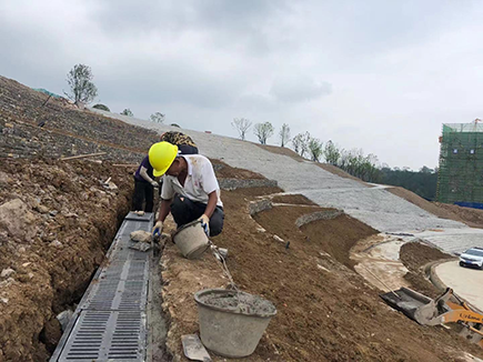 花谷擋墻由一塊一塊的扁平景觀石砌筑而成,平臺最窄處僅3米多寬,且每級臺階之間垂直落差有1.5米,在陡峭狹長的空間上,工人在石料和種植土運輸時首先將基礎(chǔ)土方開挖至臺階狀,再進行墻體基礎(chǔ)及砌筑施工。因施工材料無法直接到達現(xiàn)場,施工隊用了10-12臺鏟車將碎石、混凝土、景觀片石二次轉(zhuǎn)運至施工位置;種植土回填則是以大挖機配合小挖機,從上下兩個方向向中間轉(zhuǎn)運。