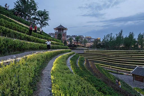 “這些‘梯田’式的臺階叫跌級花谷,原狀是由兩座崗地所夾形成的谷地,山坡坡度40%―60%,我們因形就勢,依托原地形打造出了跌級花谷擋墻。兩側(cè)擋墻各有6-8級臺階,總高差約15米?!毙鲁峭顿Y公司現(xiàn)場負(fù)責(zé)人介紹,此處以鳳冠霞帔為設(shè)計理念,由‘從荊山飛來一只鳳凰,棲息于園博園之中’的故事引申而來,仿造鳳凰的尾羽形態(tài)形成平面布局,呈流線型蜿蜒入內(nèi)。