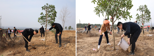 在現(xiàn)場工作人員對植樹的方法和技巧進(jìn)行了簡短介紹后,參加活動的黨員同志迅速開始勞動,大家分工合作,干勁十足,揮鍬鏟土,扶苗澆水,合力栽下了烏桕、香樟、桂花等樹苗100余株,用辛勤的汗水播散一片綠意。