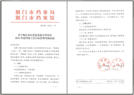 近日,市檔案局、檔案館發(fā)函確認,市城控集團直屬子公司中房集團荊門公司榮膺“省一級”檔案管理企業(yè),這是按照我省機關(guān)、企業(yè)、科技事業(yè)單位檔案工作目標(biāo)管理考評辦法規(guī)定,由市檔案館組織考評,經(jīng)市委辦公室同意所認定的結(jié)果。