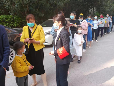 很快檢測點(diǎn)前就排起了長隊,此時的物業(yè)工作人員顧不上渾身疲憊,又馬不停蹄地全力維持現(xiàn)場秩序,引導(dǎo)業(yè)主保持一米距離,并提醒大家提前出示健康碼,面對小區(qū)內(nèi)老年人不會使用手機(jī)的情況,工作人員一一耐心進(jìn)行指導(dǎo)操作。在物業(yè)工作人員的不懈努力下,現(xiàn)場秩序井然,確保了核酸采樣工作快速、高效、有序地開展。盡管忙碌了一上午,他們卻沒有人喊過一聲苦,叫過一聲累,以實際行動履行了城控物業(yè)人的責(zé)任擔(dān)當(dāng)。