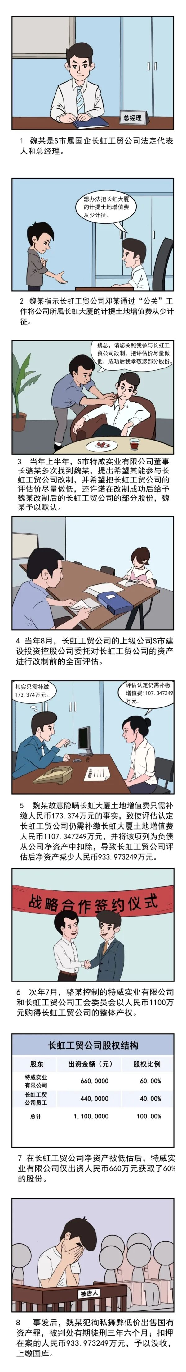 長(zhǎng)虹工貿(mào)公司的上級(jí)公司S市建設(shè)投資控股公司委托大公會(huì)計(jì)師事務(wù)所對(duì)長(zhǎng)虹工貿(mào)公司的資產(chǎn)進(jìn)行改制前的全面評(píng)估。魏某故意隱瞞長(zhǎng)虹大廈土地增值費(fèi)只需補(bǔ)繳人民幣173.374萬元的事實(shí),致使評(píng)估認(rèn)定長(zhǎng)虹工貿(mào)公司仍需補(bǔ)繳長(zhǎng)虹大廈土地增值費(fèi)人民幣1107.347249萬元,并將該項(xiàng)列為負(fù)債從公司凈資產(chǎn)中扣除,導(dǎo)致長(zhǎng)虹工貿(mào)公司評(píng)估后凈資產(chǎn)減少人民幣933.973249萬元。長(zhǎng)虹工貿(mào)公司凈資產(chǎn)被低估之后,駱某控制的特威實(shí)業(yè)有限公司和長(zhǎng)虹工貿(mào)公司工會(huì)委員會(huì)以人民幣1100萬元購(gòu)得長(zhǎng)虹工貿(mào)公司的整體產(chǎn)權(quán)。其中特威實(shí)業(yè)有限公司出資人民幣660萬元持有60%的股份,長(zhǎng)虹工貿(mào)公司員工出資人民幣440萬元持有40%的股份。