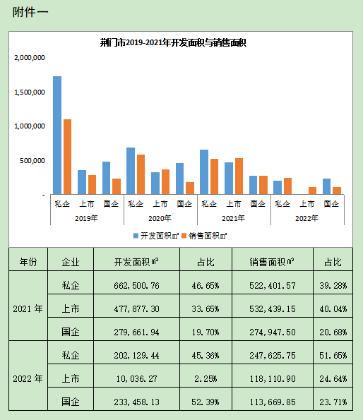 經(jīng)調(diào)查,荊門房地產(chǎn)市場近幾年整體呈現(xiàn)萎縮狀態(tài)(城區(qū)尤為突出),市場持續(xù)低迷、不穩(wěn)定性增加(今年上半年荊門城區(qū)僅成交土地1宗)。幾家大型房地產(chǎn)企業(yè)陸續(xù)因多元化、盲目擴張、高杠桿拿地、疫情、無限制調(diào)控、市場下行、銀行三條紅線管控等原因出現(xiàn)資金斷裂,導致項目停工停產(chǎn)。東寶、掇刀原民營企業(yè)開發(fā)的樓盤基本出現(xiàn)爛尾。從今年1-5月房地產(chǎn)情況看,東寶、掇刀、漳河新區(qū)同比分別負增長70.2%、49%、1.2%,出現(xiàn)斷崖式下滑。2019年-2021年間,荊門城區(qū)整體開發(fā)面積從258萬方下降至142萬方,下降幅度達44.8%。從各類型企業(yè)來看,降幅最大的是民營私企,下降幅度達61.8%。截至2021年底,荊門城區(qū)已批準預售尚未網(wǎng)簽的商品住房 16293套,面積189.6萬方。2022年,整體形勢依然不容樂觀,僅有央企、市屬國企、上市民企(洋豐集團)占主導地位。上半年僅完成開發(fā)面積44萬方,其中國有企業(yè)表現(xiàn)穩(wěn)定,完成開發(fā)量已接近去年全年水平。同期,房地產(chǎn)銷售面積同樣呈現(xiàn)持續(xù)下滑態(tài)勢,其中民營私企下滑幅度明顯,從110萬方下降至52萬方,國有企業(yè)銷售面積相對平穩(wěn)(附表見后)。
