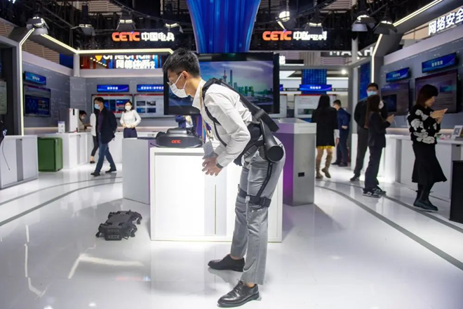在浙江烏鎮(zhèn)舉辦的2022年“互聯(lián)網(wǎng)之光”博覽會(huì)上,中國(guó)電科工作人員為觀眾演示外骨骼機(jī)器人的使用(2022年11月8日攝)。