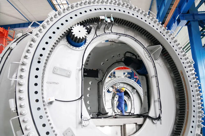 在黑龍江省齊齊哈爾市中國(guó)一重集團(tuán)有限公司風(fēng)電裝備生產(chǎn)制造廠生產(chǎn)車(chē)間,工人進(jìn)行生產(chǎn)作業(yè)(2021年7月1日攝)。新華社記者 王建威 攝