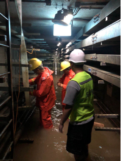 市城投公司黨委委員、安全生產(chǎn)領(lǐng)導(dǎo)小組副組長徐敏、楊晨親臨一線指揮搶險工作。他們要求,一是要集中力量消除雙喜大道綜合管廊監(jiān)控中心積水隱患,確保附屬設(shè)施完好無損;二是要在地勢低洼、且尚未安裝自動抽排設(shè)施的管廊節(jié)點加派排水泵進行人工抽排,盡可能緩解纜線管廊積水情況;三是搶險人員要注意個人生命安全,嚴(yán)格操作程序,緊急情況下要在確保個人安全的前提下開展搶險工作。