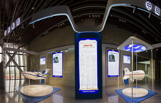 整座展廳占地面積80平方米,高4.2米,設(shè)計(jì)如鯤鵬展翅外形,映襯以藍(lán)天白云,所展示的AG600水陸兩棲飛機(jī)模型凌空翱翔,系留氣球平臺(tái)浮空萬里,視覺效果極佳。